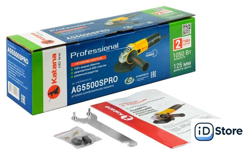 Комплект поставки | - Углошлифмашина - 1 шт. - Защитный кожух - 1 шт. - Дополнительная рукоятка - 1 шт.- Ключ фланца - 1 шт. - Фланец - 1 шт. - Быстрозажимная гайка М14 - 1 шт. - Угольные щетки - 1 шт. - Руководство по эксплуатации - 1 шт. |