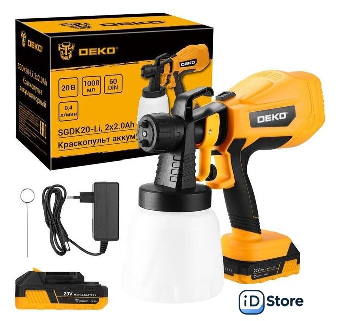 Комплект поставки | - Краскопульт – 1 шт.- Аккумулятор 2,0 Ач – 2 шт.- Зарядное устройство – 1 шт.- Стакан для измерения вязкости – 1 шт.- Игла для прочистки сопла – 1 шт.- Руководство по эксплуатации- Коробка |