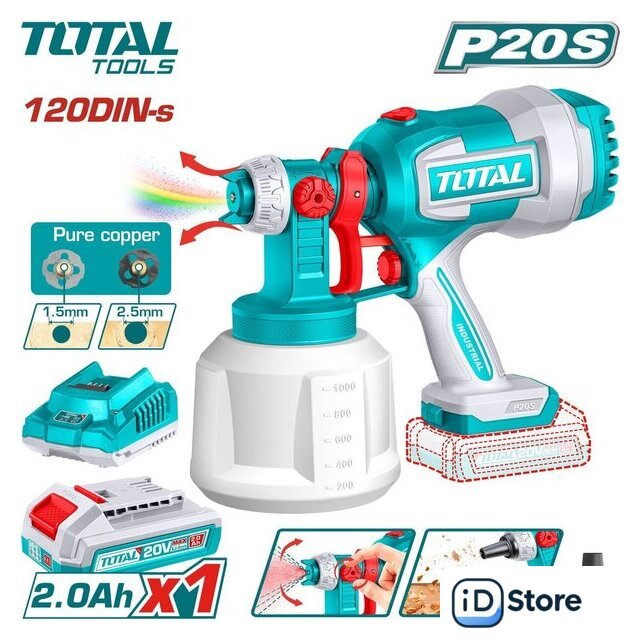 Комплект поставки | - Краскораспылитель - 1 шт.- Аккумулятор TFBLI20011 2,0 Ач - 1 шт.- Зарядное устройство TFCLI2001 - 1 шт.- Медные дюзы (1,5/2,5 мм) - 2 шт.- Мерная чаша для измерения вязкости - 1 шт.- Игла для чистки - 1 шт.- Насадка для сдувания пыли - 1 шт.- Инструкция- Коробка |