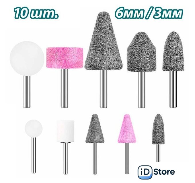 Комплектация | 5 шт. шлифовальных насадок для шлифовальной машины, хвостовик 6 мм: Цилиндрический, 19*26 мм - 1 шт Тип пули, 14*25 мм - 1 шт. Конус, 25*38 мм - 1 шт. Т-образный, 25*13 мм - 1 шт. Круглый, 23*24 мм - 1 шт.5 шт. шлифовальных насадок для гравера, хвостовик 3 мм: Тип пули, 10*18 мм - 1 шт. Конус, 13*21 мм - 1 шт. Конус, 13*21 мм - 1 шт. Т-образный, 12*13 мм - 1 шт. Круглый, 12*12 мм - 1 шт. |