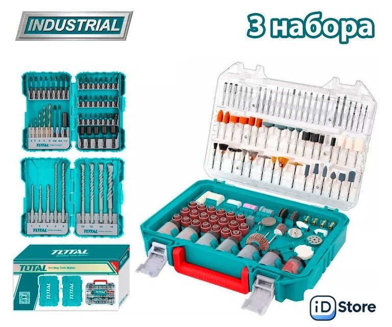 Комплектация | Набор оснастки и ручного инструмента TOTAL TACSDL24502 (45 предметов): Биты ударные 25 мм (SL3, SL4, SL5, SL6, PH1, PH2, PH3, PZ1, PZ2, PZ3, H3, H4, H5, H6, S1, S2, S3, T10, T15, T20, T25, T30, T40) - 23 шт. Биты ударные 50 мм (SL4, SL5, PH1, PH2, PZ1, PZ2, T23, T30) - 8 шт. Биты ударные 89 мм (PH2, SL5) - 2 шт. Адаптер - 1 шт. Держатель для бит Hex 1/4 - 1 шт. Сверла по металлу (2 , 3 , 4 , 5 , 6 мм) - 5 шт. Торцевые насадки магнитные 48 мм (6, 7, 8, 9, 10 мм) - 5 шт. Пластиковый кейс для хранения - 1 шт.Набор буров SDS-plus TOTAL TACSDL30901 (9 шт.): Бур SDS-plus 5x110 мм - 1 шт. Бур SDS-plus 6x110 мм - 1 шт. Бур SDS-plus 8x110 мм - 1 шт. Бур SDS-plus 6x160 мм - 1 шт. Бур SDS-plus 8x160 мм - 1 шт. Бур SDS-plus 10x160 мм - 1 шт. Бур SDS-plus 12x160 мм - 1 шт. Бур SDS-plus 14x160 мм - 1 шт. Бур SDS-plus 16x160 - 1 шт. Пластиковый кейс для хранения - 1 шт.Набор аксессуаров для гравера (450 предметов): Шлифовальный диск (грубый) - 50 шт. Шлифовальный диск (средний) - 50 шт. Шлифовальный диск (тонкий) - 50 шт. Отрезной круг для высоких нагрузок - 40 шт. Отрезной круг обычный - 40 шт. Отрезной круг из стекловолокна - 6 шт. Шлифовальный круг - 18 шт. Шлифовальная лента - 32 шт. Алмазная коронка - 10 шт. Цанга - 4 шт. Шлифовальный стержень - 2 шт. Войлочное колесо - 4 шт. Войлочное колесо заостренное - 2 шт. Войлочный круг - 2 шт. Резиновый наждачный круг - 1 шт. Алмазный отрезной диск - 1 шт. Фетровый круг - 1 шт. Точильный камень - 1 шт. Лепестковый круг - 2 шт. Латунная щетка - 3 шт. Щетка из щетины - 3 шт. Щетка из нержавеющей стали - 3 шт. Шлифовальный круг из оксида алюминия с хвостовиком - 6 шт. Шлифовальный круг из карбида кремния с хвостовиком - 4 шт. Оправка для отрезных кругов - 3 шт. Оправка для войлочных кругов - 3 шт. Резак из быстрорежущей стали - 3 шт. Сверло из быстрорежущей стали - 6 шт. Шерстяной полировщик с хвостовиком - 3 шт. Резиновый полировщик с хвостовиком 4 шт. Полировальная паста - 1 шт. Ключ - 1 шт. Пластиковый кейс - 1 шт. |