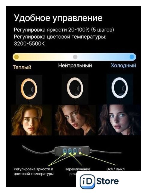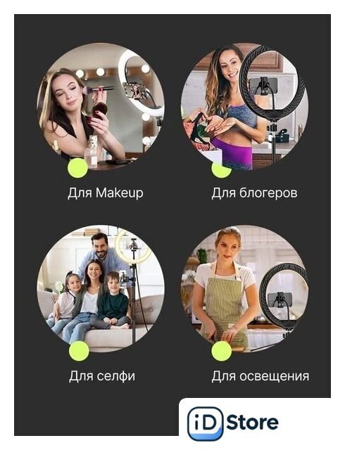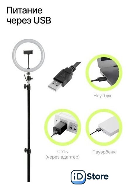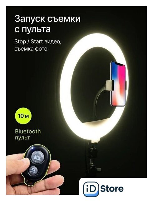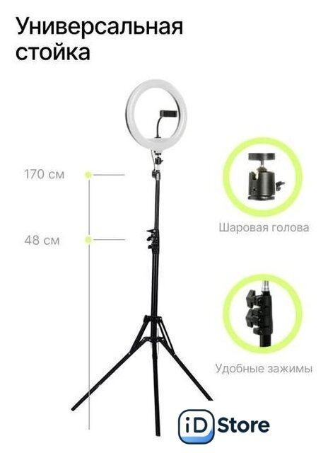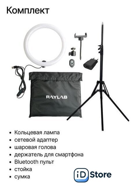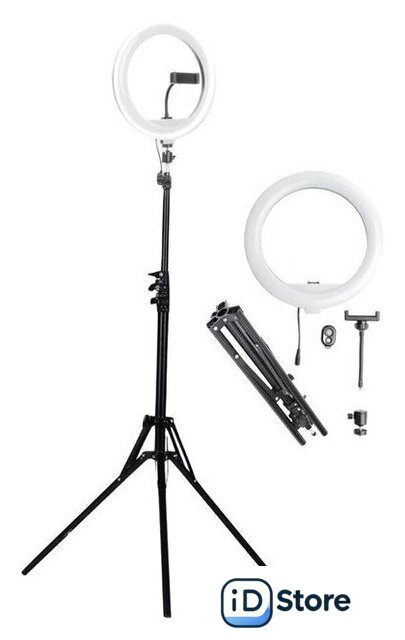 Комплектация | - Кольцевая лампа- Стойка /Штатив- Держатель смартфона- Панельуправления лампой- Пульт дистанционного управления лампой- Пульт дистанционного управления смартфоном (Bluetooth)- Сумка- Переходник с USB на розетку- Шаровая голова |