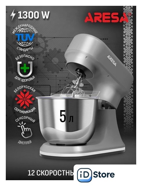 | Полная комплектация | съемная чаша из нержавеющей стали 5 л, венчик для взбивания, крюк для замешивания теста, насадка для смешивания, защитная крышка чаши, прорезиненные ножки, инструкция |