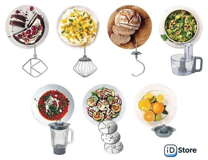 Функции | блендер, цитрус-пресс, взбивание, смешивание, замешивание дрожжевого теста, измельчитель, рубка, терка, шинковка, ломтерезка, драники |