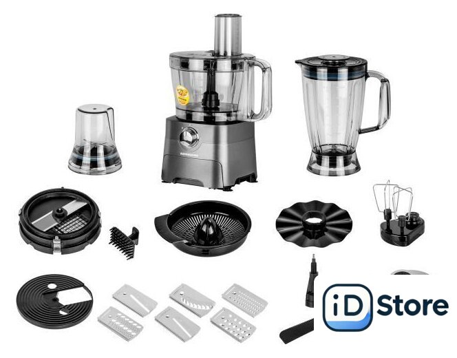 Полная комплектация | Комбайн - 1 шт.;Чаша чоппера - 1 шт.;Приводной вал - 1 шт.;Чаша блендера - 1 шт.;Кондитерская лопатка - 1 шт.;Насадка-кубикорезка - 1 шт.;Толкатель для насадки-кубикорезки - 1 шт.;Кофемолка - 1 шт.;Насадка-венчики - 1 шт.;Комплект ножей для комбайна - 6 шт.;Вращающийся диск - 1 шт.;Соковыжималка - 1 шт.;Насадка для приготовления эмульсий - 1 шт.;Насадка для измельчения - 1 шт.;Насадка для перемешивания - 1 шт.;Руководство по эксплуатации - 1 шт |