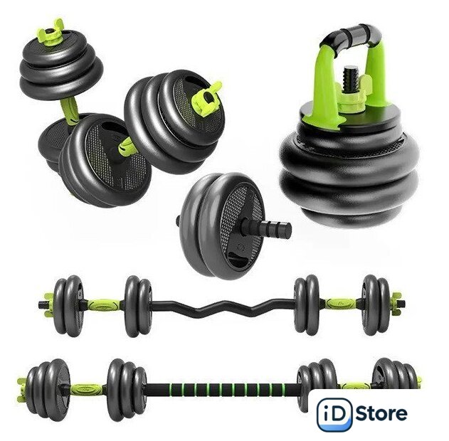 Комплектация | • Диск 1,25 кг. (4 шт.):- Диаметр диска: 17 см.- Толщина диска: 3,5 см.• Диск 2,5 кг. (4 шт.):- Диаметр диска: 21 см.- Толщина диска: 4,5 см.• Диск 3 кг. (8 шт.):- Диаметр диска: 22 см.- Толщина диска: 4,5 см.• Гриф гантельный: 2 шт.- Длинна гантельного грифа: 40,5 см.- Диаметр: 2,49 см.• Гриф соединительный прямой: 1 шт.- Длинна соединительного грифа прямого: 39 см.• Гриф соединительный w-образный: 1 шт.- Длинна соединительного грифа w-образного: 59 см.• Гриф для гири: 1 шт.- Длинна соединительного грифа для гири: 50 см.• Гриф для ролика для пресса: 1 шт.• Упор для отжиманий (ручка гири): 2 шт.• Перчатки (пара): 1 шт.• Цвет: черный, зелёный.• Гайка-замок на гриф: 8 шт. |