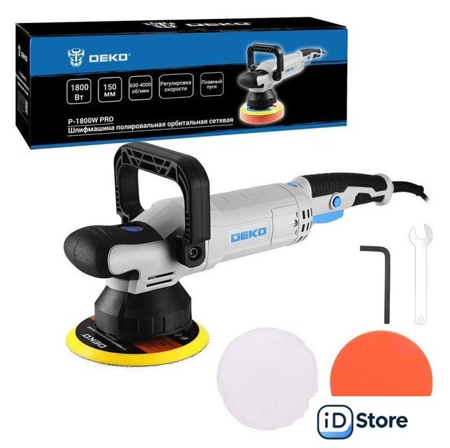 Комплект поставки | - Полировальная машина – 1 шт.- Опорная тарелка – 1 шт.- Полировальный круг (шерстяной, поролоновый) – 2 шт.- Дополнительная рукоятка – 1 шт.- Винт – 2 шт.- Шестигранный ключ – 1 шт.- Гаечный ключ – 1 шт.- Угольные щетки – 2 шт.- Руководство по эксплуатации- Коробка |