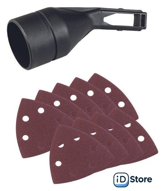| Комплект поставки | - адаптер для удаления пыли (36 мм);- 9 шлифовальных листов (2x K60, 2x K120, 2x K240, 3x K400). |