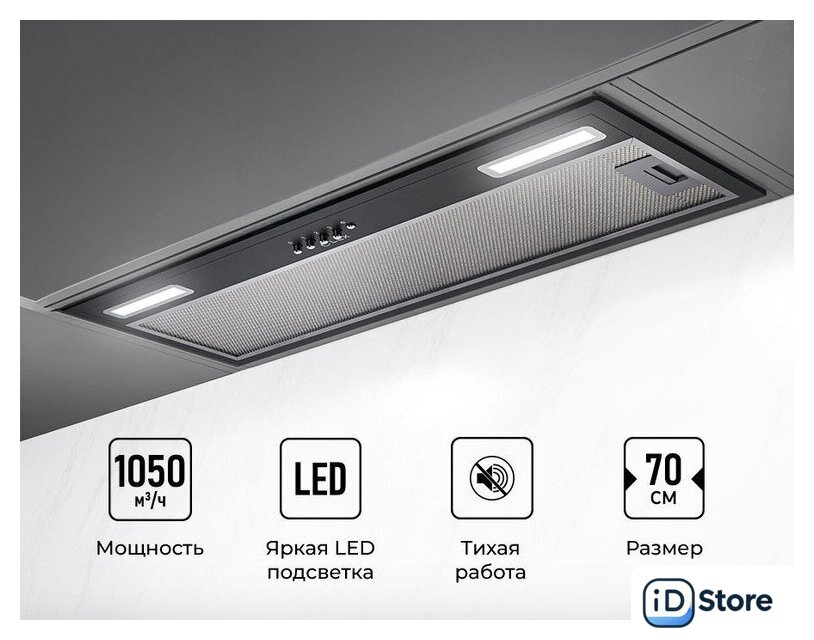 конструкция скрытая, монтаж для встраивания, ширина 69.6 см, управление механическое/кнопочное, производительность мотора 1050 м³/ч, цвет черный
