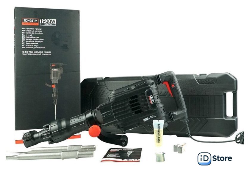 | Комплектация | - Отбойный молоток;, - Пикообразное зубило (30х410 мм);, - Плоское зубило (30х410 мм);, - Емкость для масла;, - Ключ гаечный;, - Комплект угольных щеток;, - Руководство по эксплуатации;, - Пластиковый кейс. |