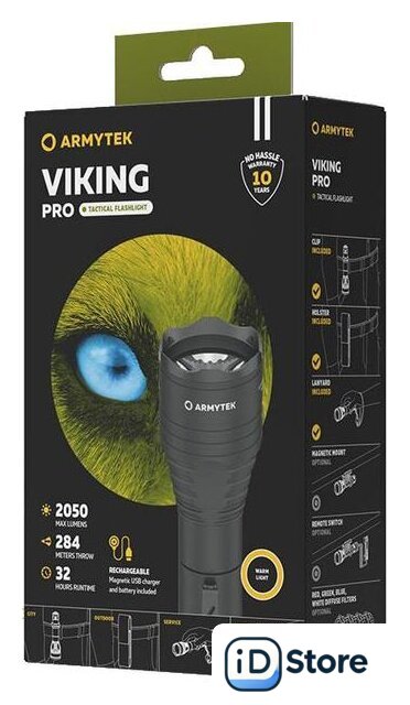 Комплект поставки | - фонарь;- аккумулятор 18650;- быстрая магнитная USB-зарядка;- стальная клипса;- ремешок на руку;- нейлоновый чехол;- силиконовый грип-упор;- два запасных уплотнительных кольца;- инструкция. |