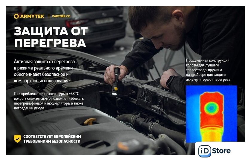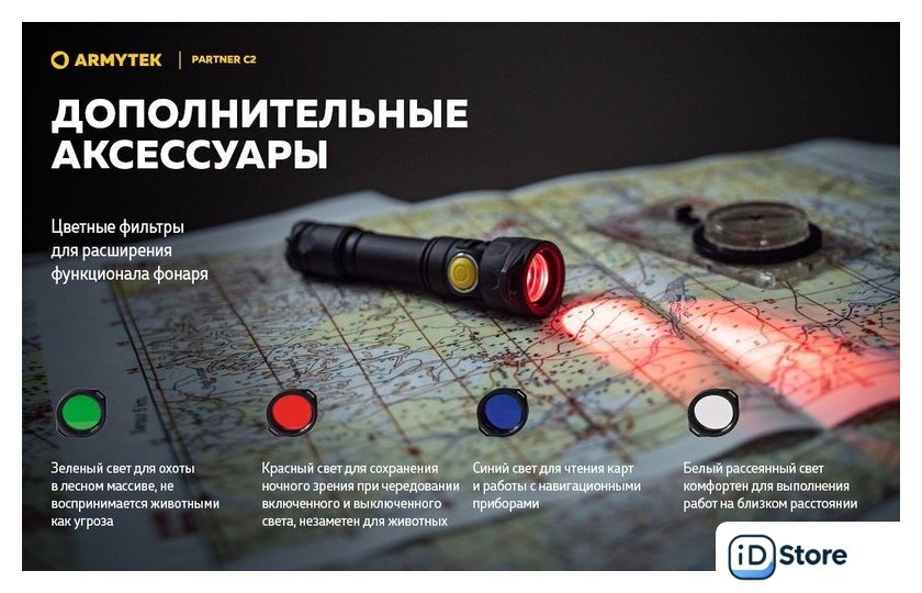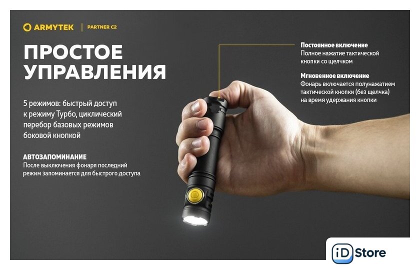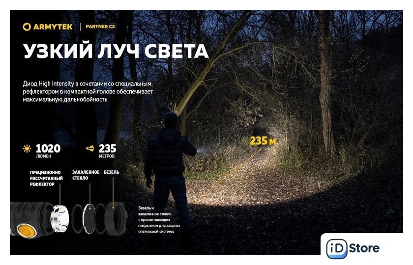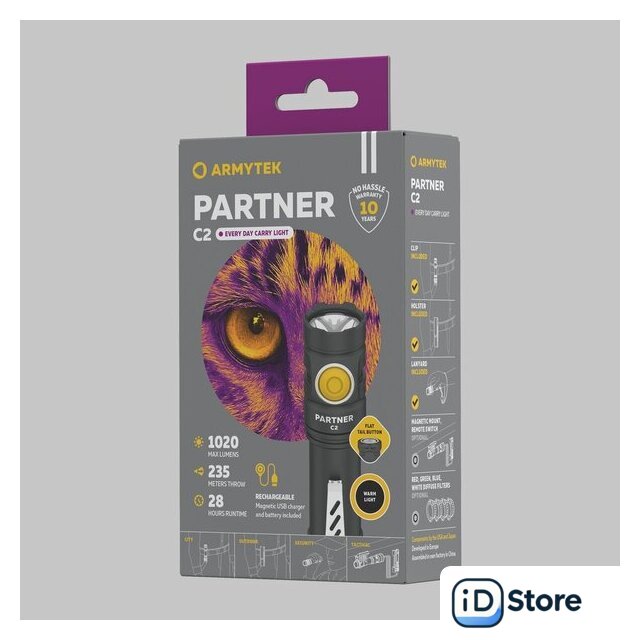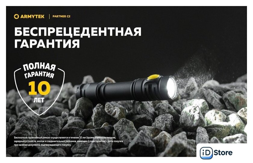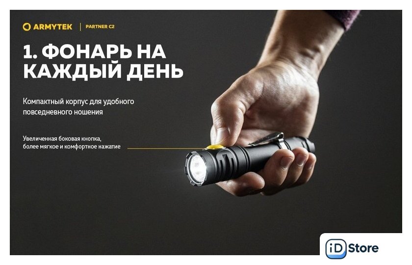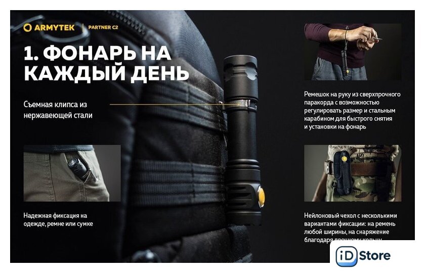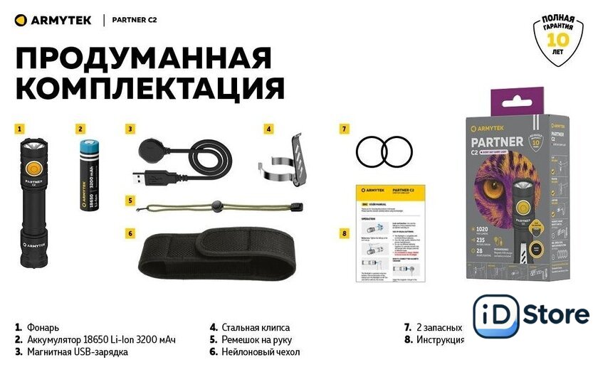 Комплект поставки | - Фонарь;- Аккумулятор;- Магнитная USB-зарядка;- Стальная клипса;- Нейлоновый чехол;- Ремешок на руку;- 2 запасных уплотнительных кольца;- Инструкция. |