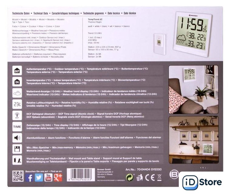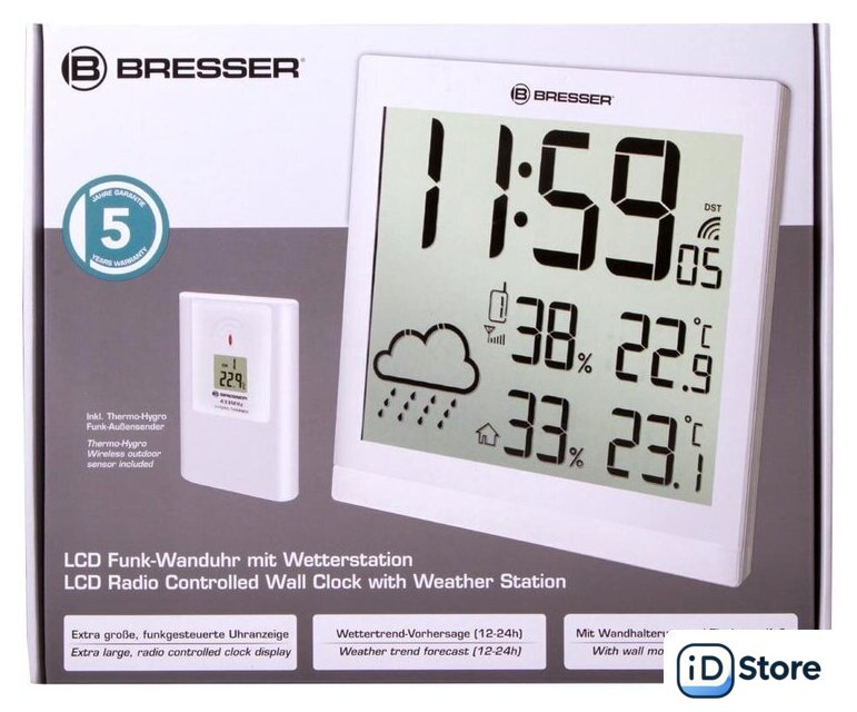 | Комплектация | Метеостанция (настенные часы)Наружный датчикИнструкция по эксплуатации и гарантийный талон |