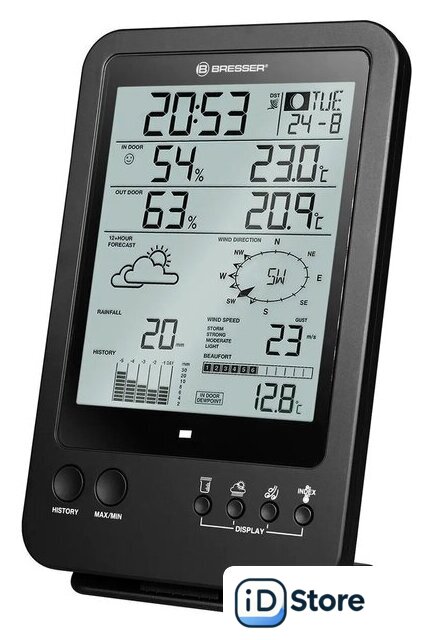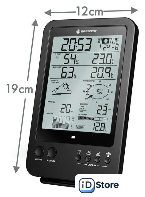 | Особенности | Множество функций в одном метеоприбореПоказывает время, есть будильник и календарьВстроенные гигрометр, термометр, ветромер, барометр и дождемерСоставляет прогноз погоды на 12 часовПитание от стандартных батареек, настенное и настольное размещение |
