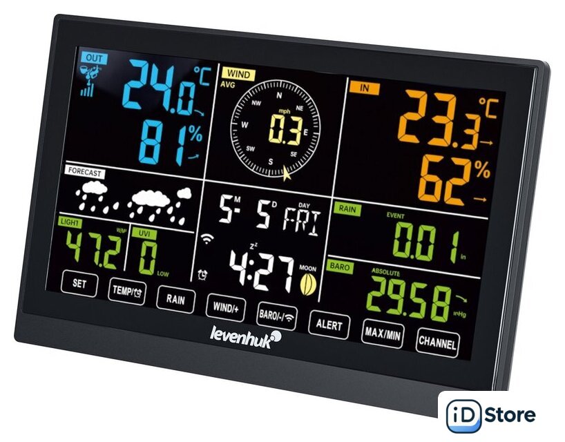 | Особенности | замеры давления, влажности, температуры, скорости ветра, количества и интенсивности осадков; запись истории показаний; подключение к Wi-Fi; встроенные часы и будильник |