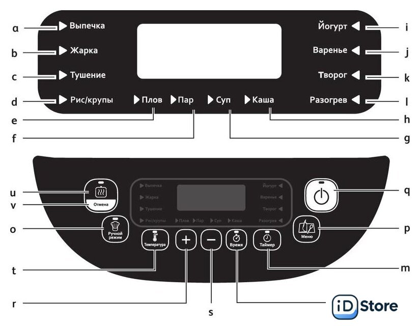 | Перечень режимов работы | Ручной режим;Выпечка;Обжарка/корочка;Тушение;Приготовление на пару;Рис/крупы;Плов;Творог;Каша;Йогурт;Варенье;Суп. |