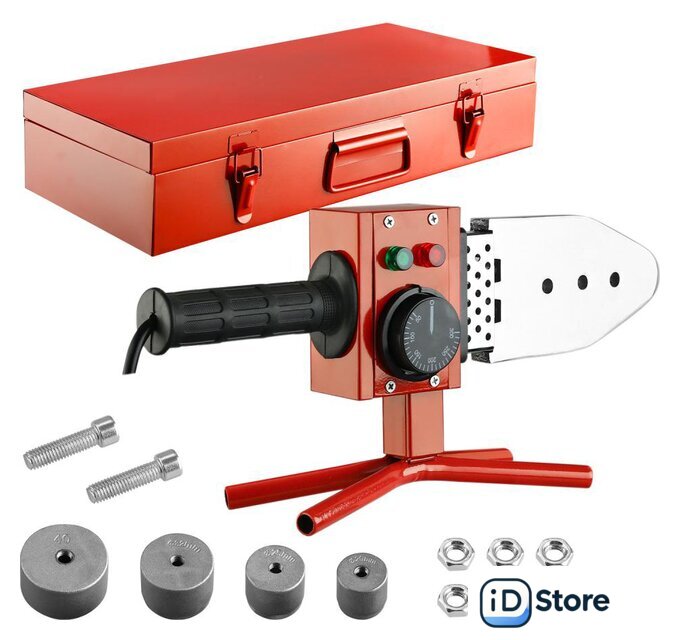 Комплектация | Аппарат для сварки - 1 штПодставка - 1 штКлюч шестигранный - 1 штНасадки - 20, 25, 32, 40 мм - 4 штВинт - 2 штГайка - 6 штКейс - 1 шт |
