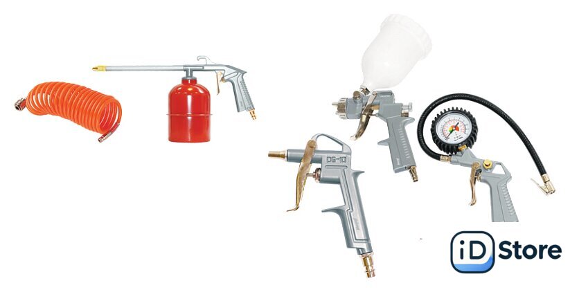 Комплектация | краскораспылитель с верхним бачком объемом 0,6 лпневмопистолет для вязких жидкостей с бачком 0,85 лпневмопистолет для продувкипневмопистолет для накачки шин с манометормспиральный шланг 5м |