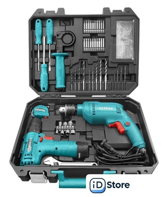 Комплектация | - Дрель-шуруповерт TOTAL TDLI12415 - 1 шт.- Аккумулятор 1,5 Ач - 1 шт.- Зарядное устройство - 1 шт.- Ударная дрель TOTAL TG1061356 - 1 шт.- Отвертка PH1 * 100 - 1 шт.- Отвертка SL5.5 * 100 - 1 шт.- Отвертка с магнитным хвостовиком, 150 мм - 1 шт.- 6-дюймовый разводной ключ - 1 шт.- Рулетка 3 м - 1 шт.- Сверла по каменной кладке (4, 5, 6, 8, 10 мм) - 5 шт.- Спиральные сверла (2, 3, 4, 5, 6 мм) - 5 шт.- Сверла по дереву (4, 5, 6, 8 мм) - 4 шт.- Торцевые насадки (5, 6, 7, 8, 9, 10, 11мм) - 7 шт- Биты: SL3, SL4, SL5, SL6, PH0, PH1, PH2, PH3, PZ0, PZ1, PZ2, PZ3, T10, T15, T20, T30, H3, H4, H5, H6 - 20 шт.- Винты (10 шт. * ST3.5, 15 шт. * ST4, 10 шт. * ST5) - 35 шт.- Пластиковые дюбеля (10 шт. * 5 мм, 15 шт. * 6 мм, 10 шт. * 8 мм) - 35 шт.- Кейс |