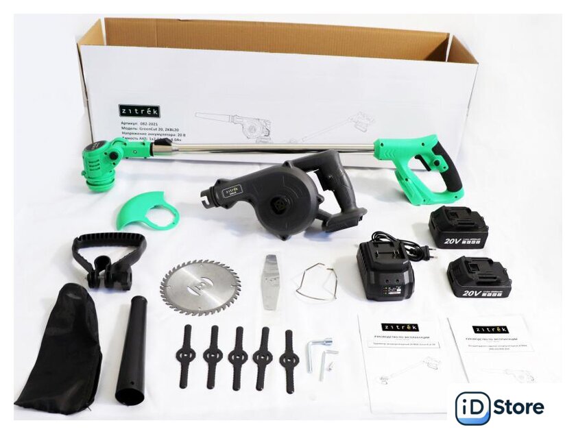 Комплектация | Триммер GreenCut 20:Триммер - 1 шт.Режущий диск - 1 шт.Пластиковые ножи - 5 шт.Металлический нож - 1 шт.Защитный кожух - 1 шт.Металлическая скоба - 1 шт.Дополнительная рукоятка - 1 шт.Шестигранный ключ - 1 шт.Ключ торцовочный - 1 шт.Винт - 1 штРуководство по эксплуатации - 1 шт.Воздуходувка ZKBL20:Воздуходувка - 1 шт.Насадка-труба - 1 шт.Мешок для сбора пыли - 1 шт.Руководство по эксплуатации - 1 шт.Аккумулятор 2,0 Ач - 1 шт.Аккумулятор 4,0 Ач - 1 шт.Зарядное устройство - 1 шт. |