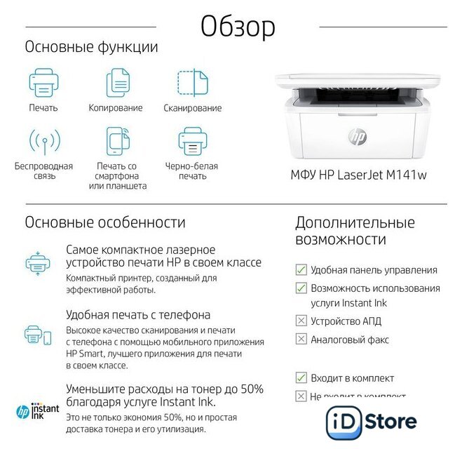Комплектация | МФУ HP LaserJet M141a; кабель питания; картридж HP LaserJet с черным тонером (ресурс: 500 страниц); плакат с инструкциями по настройке; справочное руководство; руководство по гарантии; рекламная листовка |