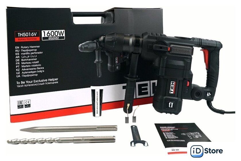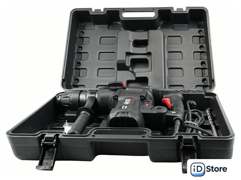 | Комплект поставки | - Перфоратор;, - Рукоятка дополнительная;, - Гаечный ключ;, - Набор оснастки;, - Смазка для буров;, - Комплект угольных щеток;, - Руководство по эксплуатации;, - Кейс. |