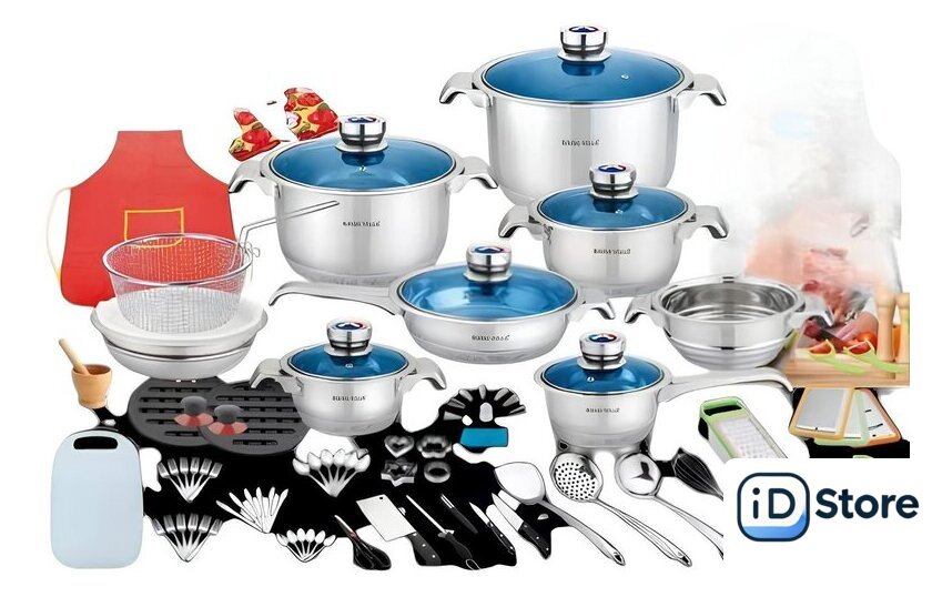 Состав набора | 4 кастрюли с крышкой, 1 ковш с крышкой, 1 корзина для фри, 1 пароварка, 1 миска, 1 сковорода с крышкой, 2 подставки, 1 пара перчаток, 1 разделочная доска, две ручки, 1 передник, 12 ложек, 12 вилок, 12 столовых ножей, набор кухонных аксессуаров из 45 единиц |
