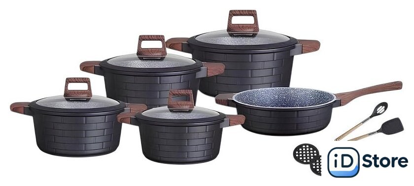 | Состав набора | кастрюля (4 шт.), крышка (4 шт.), сковорода, подставка под горячее (2 шт.), шумовка, лопатка |