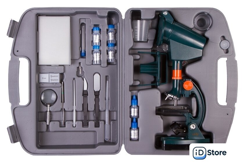 | Состав набора | МикроскопОкулярный проекторАдаптер для фотоаппаратаОкулярГотовые микропрепараты (5 шт.)Предметные стекла (18 шт.)Покровные стекла (36 шт.)Наклейки для стекол (18 шт.)Флакон с красителем (2 шт.)Пустой флакон (4 шт.)ЛупаСкальпельЛопаточкаПинцетПалочка для размешиванияПробирка с пробкойЧашка ПетриПипеткаМерный стаканчикЗапасная лампочкаПластиковый кейс |