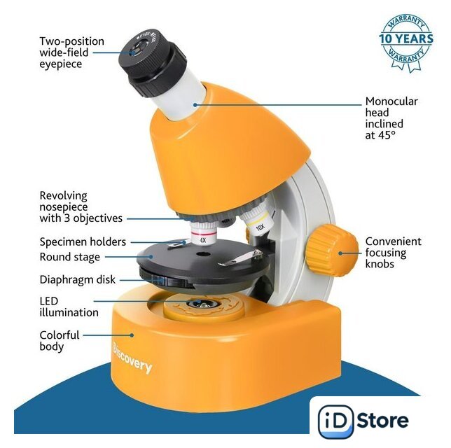 | Состав набора | микроскоп, объективы 4х, 10х и 40х, окуляр WF10x–16x, круглый предметный столик с зажимами, диск с диафрагмами, встроенный нижний осветитель на светодиодах, книга знаний «Невидимый мир», набор микропрепаратов Levenhuk Discovery «Флора и фауна» (24 шт.), инструкция по эксплуатации и гарантийный талон |