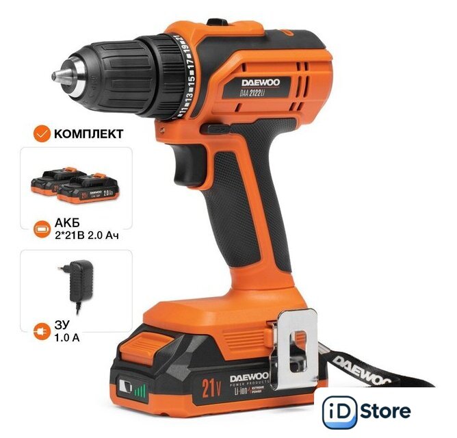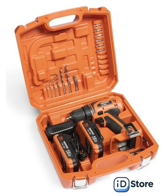 Комплектация | - Дрельшуруповерт - 1 шт.- Аккумуляторная батарея 2,0 Ач- 2 шт.- Зарядное устройство - 1 шт.- Набор бит - 1 комплект- Набор сверл - 1 комплект- Держатель для бит - 1 шт.- Скоба для крепления - 1 шт.- Руководство по эксплуатации - 1 шт.- Гарантийный талон - 1 шт.- Кейс для хранения и переноски - 1 шт. |