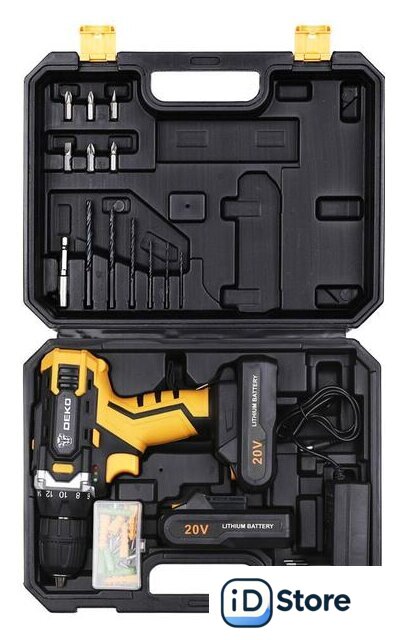 Комплектация | - Дрель-шуруповерт;- Аккумулятор - 2 ш;- Зарядное устройство;- Инструкция;- Кейс;Поставляется с набором в 63 предмета:Биты - 6 шт;Сверла - 6 шт;Удлинитель бит - 1 шт;Набор крепежа - 50 шт. |