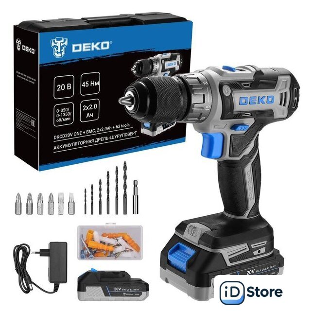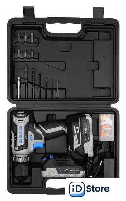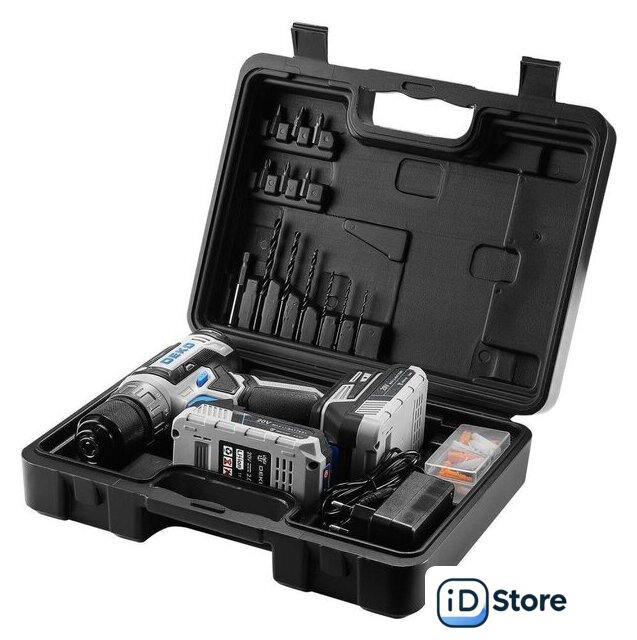 Комплектация | - Дрель-шуруповерт аккумуляторная - 1 шт.- Аккумулятор - 2 шт.- Зарядное устройство - 1 шт.- Сверла - 6 шт.- Биты - 6 шт.- Магнитный держатель бит - 1 шт.- Комплект крепежа - 50 шт.- Руководство по эксплуатации - 1 шт.- Кейс - 1 шт. |