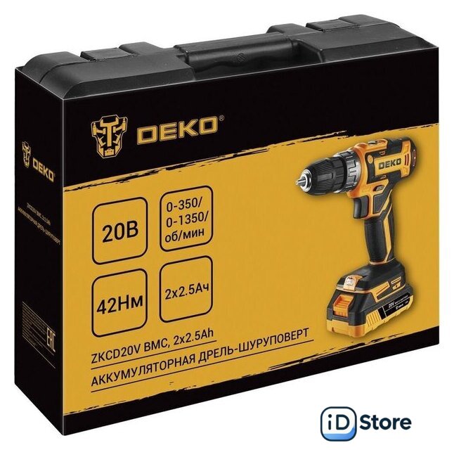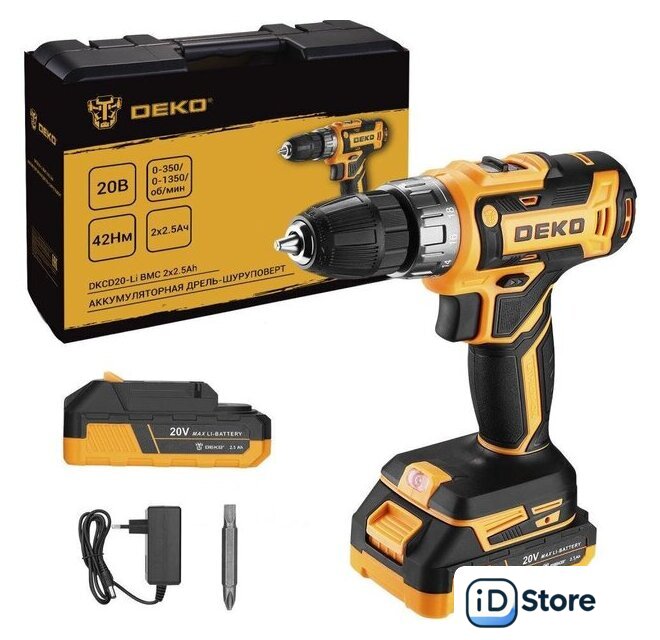 Комплектация | - Дрель-шуруповерт - 1 шт.- Аккумулятор 2,5 Ач - 2 шт.- Зарядное устройство - 1 шт.- Бита - 1 шт.- Руководство по эксплуатации- Кейс |