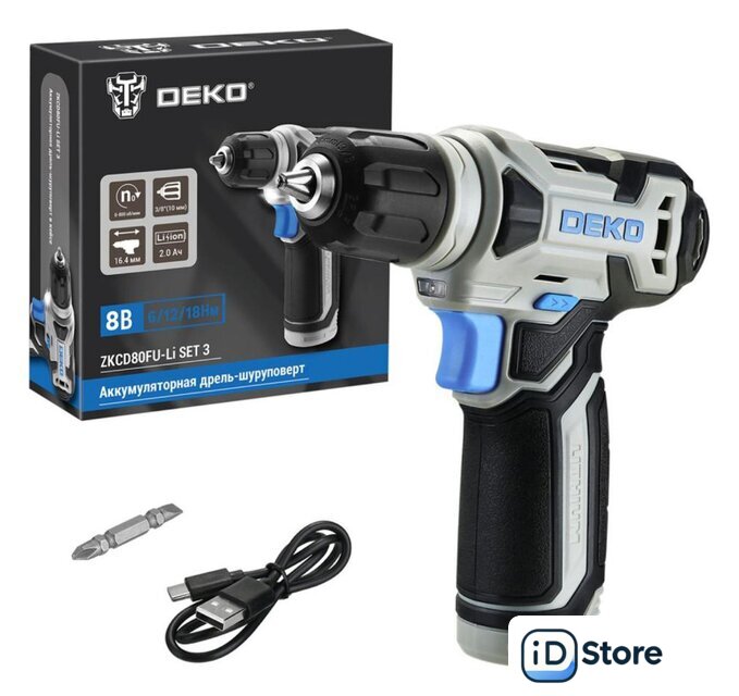 | Комплектация | - 1 шт аккумуляторная дрель-шуруповерт DEKO ZKCD80FU-Li;- 1 шт бита;- 1 шт кабель для зарядки Type-C. |