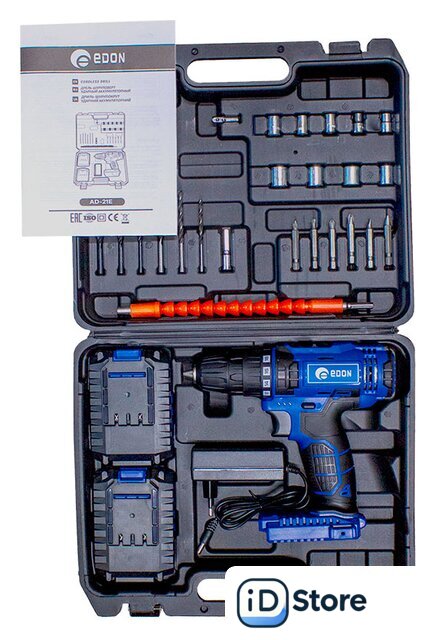 Комплектация | - Дрель-шуруповерт- 2 аккумулятора- Зарядное устройство- Набор насадок- Инструкция- Кейс |