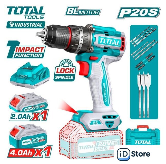 Комплектация | - Ударная дрель-шуруповерт - 1 шт.- Аккумулятор 2,0 Ач TFBLI20011 - 1 шт.- Аккумулятор 4,0 Ач TFBLI20021 - 1 шт.- Зарядное устройство TFCLI20411 - 1 шт.- Двухсторонняя бита PH2+PH2 - 1 шт.- Двухсторонняя бита PH2+SL6 - 1 шт.- Сверло по дереву (16, 19, 22 мм) - 3 шт.- Сверло HSS по металлу (4, 5, 6 мм) - 3 шт.- Сверло по камню (5, 6, 8 мм) - 3 шт.- Инструкция- Кейс |