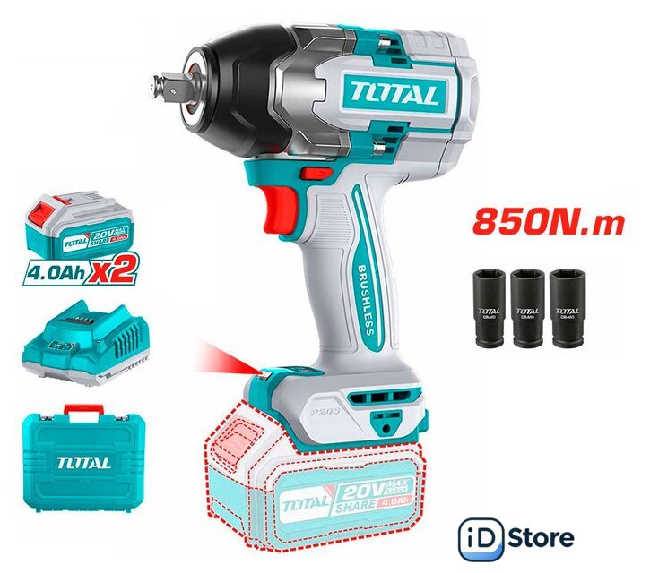 | Комплектация | - Гайковерт - 1 шт.- Аккумулятор 4,0 Ач - 2 шт.- Зарядное устройство - 1 шт.- Торцевая голока (22, 24, 27 мм) - 3 шт.- Инструкция- Кейс |