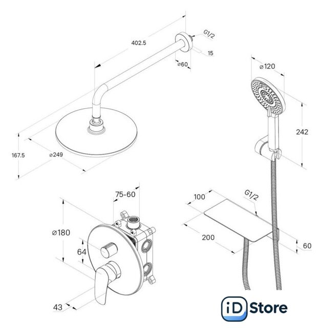 | Комплектация | верхний душ, ручной душ (лейка), держатель лейки, шланг, смеситель |