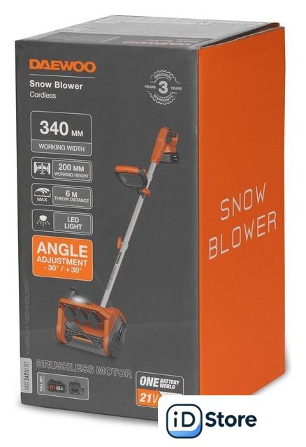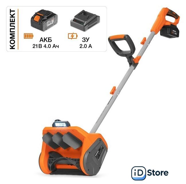 | Комплектация | - Снегоуборщик- Аккумуляторная батарея 1 шт- Зарядное устройство 1 шт- Инструкция по эксплуатации- Гарантийный талон |