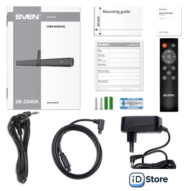 | Комплект поставки | - пульт ДУ- батарейки для пульта ДУ (2xAAA)- оптический аудиокабель- аудиокабель 3.5 мм- адаптер 3.5 мм - 2RCA- адаптер питания- набор для настенного крепежа- документация |