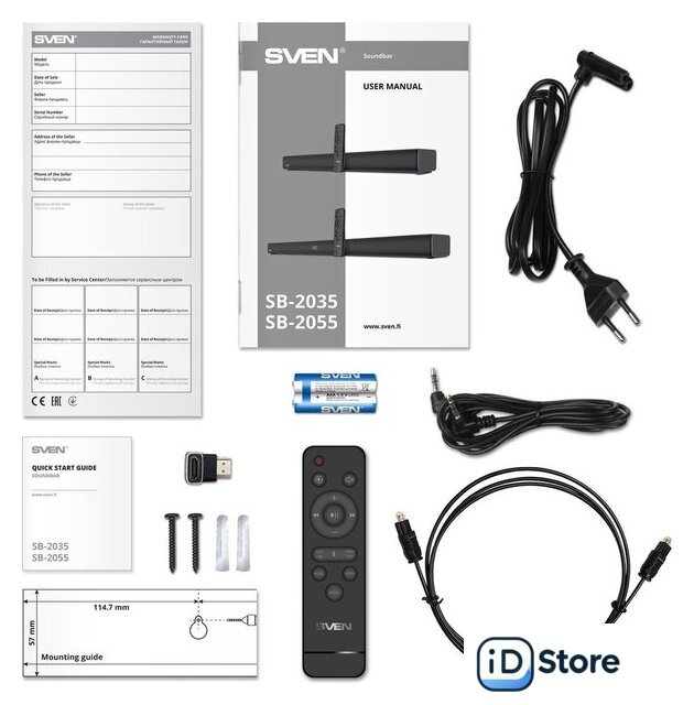 | Комплект поставки | - пульт ДУ- батарейки для пульта ДУ (2xAAA)- оптический аудиокабель- аудиокабель 3.5 мм- адаптер HDMI угловой - адаптер питания- набор для настенного крепежа- документация |