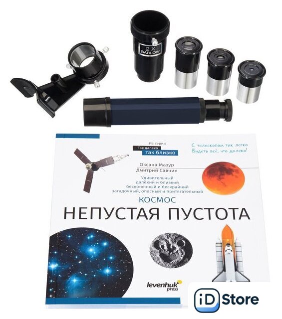 | Комплект поставки | Оптическая труба телескопа, Окуляр SR4 мм, Окуляр H12,5 мм, Окуляр H20 мм, Оптический искатель 5х24, Линза Барлоу 2х, Экваториальная монтировка EQ2, Ручки тонких движений, Противовес, Штанга противовеса, Крепежное кольцо, Алюминиевая тренога с лотком для аксессуаров, Книга знаний «Космос. Непустая пустота», Инструкция по эксплуатации и гарантийный талон |