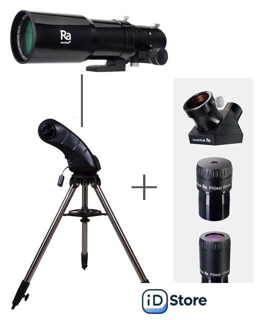 | Комплект поставки | Оптическая труба Levenhuk Ra R80 ED Doublet, монтировка Sky-Watcher Star Discovery Wi-Fi AZ SynScan GOTO, стальная тренога, адаптер Wi-Fi SynScan GOTO, лоток для аксессуаров, диагональное зеркало Levenhuk Ra 1,25", 99%, окуляр Levenhuk Ra Plössl 6 мм, 1,25", окуляр Levenhuk Ra Plössl 17 мм, 1,25", алюминиевый кейс, защитные крышки, салфетка для очистки оптики, инструкция по эксплуатации и гарантийный талон. |