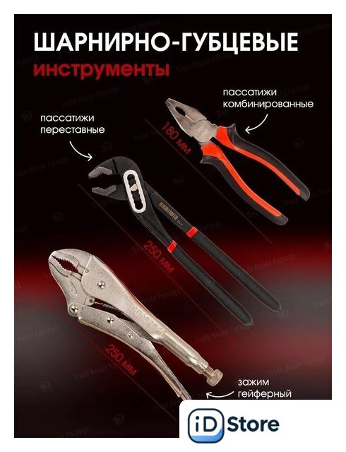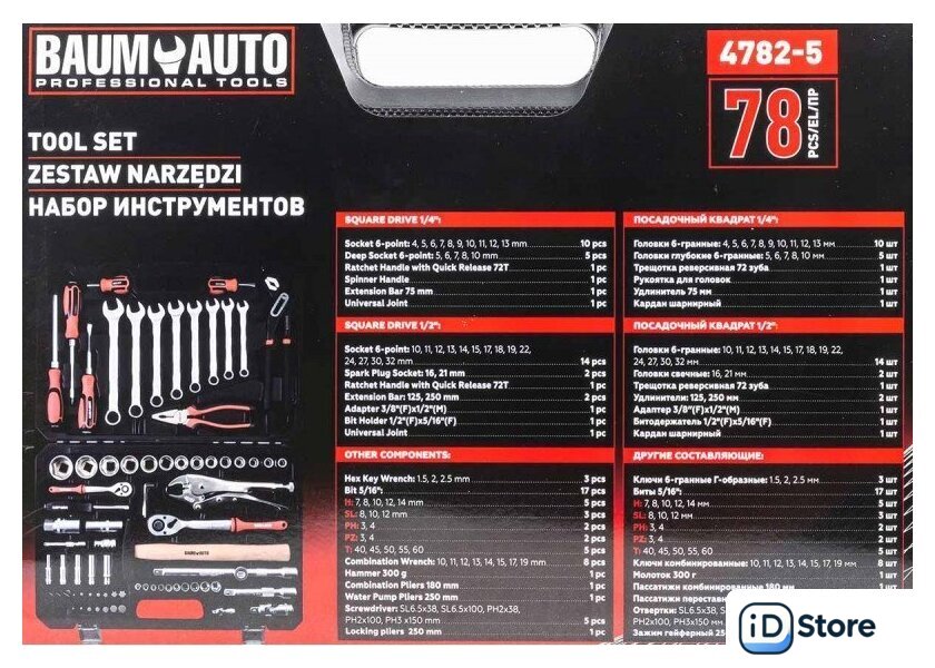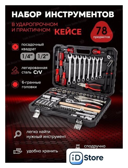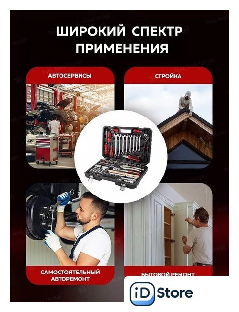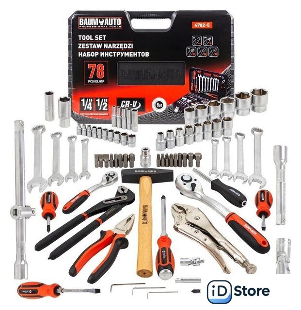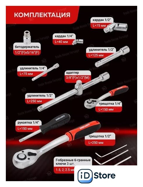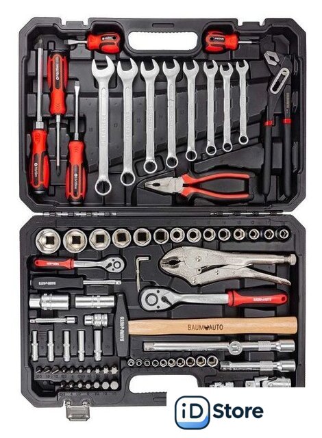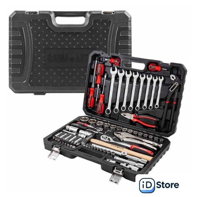 | Комплектация | трещотка (2 шт.), отвертка (5 шт.), пассатижи (2 шт.), молоток (1 шт.), зажим (1 шт.), ключ гаечный (11 шт.), головки (31 шт.), насадки-биты (17 шт.), удлинители (3 шт.), кардан (2 шт.), держатель (1 шт.), адаптер (1 шт.), кейс |