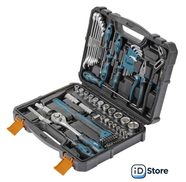 Комплектация | Головки 1/2" (11 шт) Головки 1/4" (8 шт) Головка торцевая свечная, 1/2" (2 шт) Шарнир карданный 1/2 (1 шт) Удлинитель 1/2":125 мм (1 шт) Рукоятка с трещеткой квадрат 1/2 (1 шт) Ключ комбинированный (7 шт) Ключ шестигранный (9 шт) Плоскогубцы 160мм (1 шт) Ключ разводной (1 шт) Отвертка (5 шт) Молоток (1 шт) Переходник для торцевых головок (1 шт) Биты 1/4 (33 шт) Отвертка для бит (1 шт) |