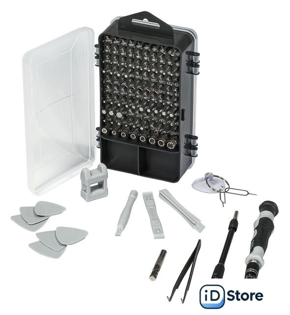 Комплектация | - Отвертка-держатель для бит (1 шт)- Гибкий вал (1 шт)- Держатель для бит (1 шт)- Пинцет (1 шт)- Лопатка (3 шт)- Ключ для SIM карты (2 шт)- Магнит (1 шт)- Присоска (1 шт)- Медиатор (6 шт)- Биты 25 мм (98 шт)- Удлинитель для бит (1 шт)- Кейс (1 шт) |