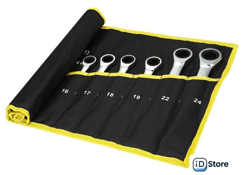 Комплектация | Набор комбинированных трещоточных ключей: сумка; 7 мм; 8 мм; 10 мм; 11 мм; 12 мм; 13 мм; 14 мм; 15 мм; 16 мм; 17 мм; 18 мм; 19 мм; 22 мм; 24 мм |