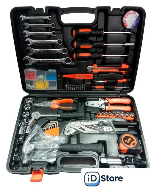 Комплектация | Переставные клещи -1шт Длинногубцы 6" - 1штСтриппер для зачистки проводов -1штКомбинированный ключ -6 штНабор ключей шестигранников - 8штМолоток-1 штОтвертка 2штНабор отверток для точечных работ 2 штИндикаторная отвертка -пробник 1штИзолента 1штРулетка 3м-1штМонтажный нож-1штТорцевые головки 1/4-9штГоловка торцевая свечная 3/8 16мм-1штГоловка торцевая свечная 3/8 21мм-1штУдлинитель 3/8" 75мм-1штТрещотка 3/8"-1штТорцевые головки 3/8-10штОтвертка-битодержатель -1штНабор бит 25мм 9штБита - адаптер для торцевых головок 1штНабор бит 50мм 10штНабор крепежа 1штКейс 1шт |