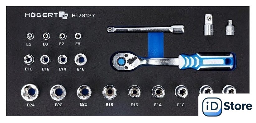 | Комплектация | - Торцевые головки 1/4’’: E5, E6, E7, E8; 3/8": E10, E12, E14, E16 (HT1A884), - Переходник: HT1A771, - Переходник: HT1A772, - Удлинитель 3/8": HT1A714, - Трещотка 3/8": HT1R328, - Торцевые головки 1/2": E10, E11, E12, E14, E16, E18, E20, E22, E24 (HT1A880) |